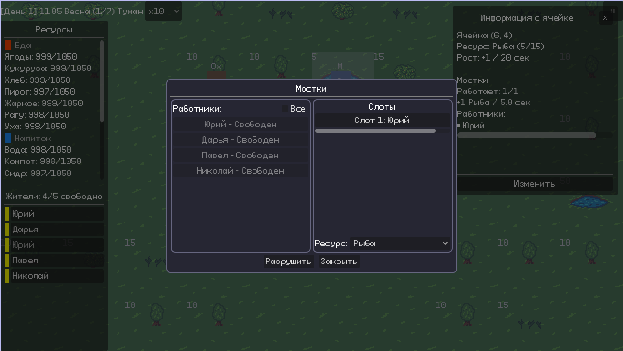- Villager Management — assign workers to buildings, monitor their hunger, thirst, and happiness